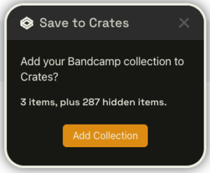 TL;DR: Install the Crates browser extension, pair it with Crates, open your Bandcamp Collection page, click the extension, and start the import. Your purchases will appear under Online Libraries > Bandcamp.